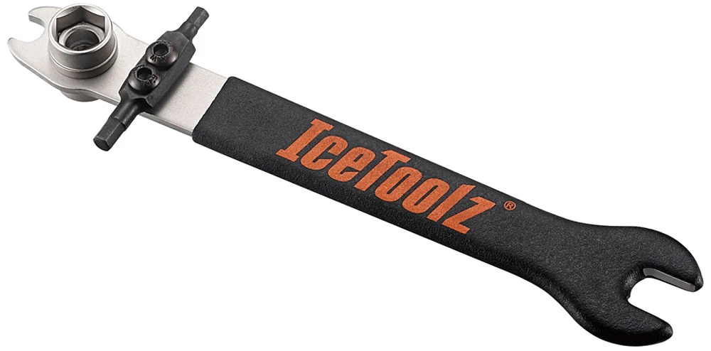 Cet outil incroyablement pratique d’IceToolz est d’un côté une clé à pédale qui, grâce à son ouverture de 15 mm, permet de fixer ou de retirer toutes les pédales courantes de la manivelle, et de l’autre une clé pour les vis de manivelle des roulements intérieurs carrés.