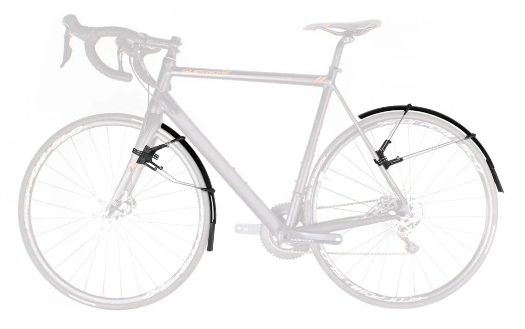système de fixation Quick-Release à deux articulations s’adapte également aux fourches aéro et aux freins à disque. Les garde-boue peuvent être parfaitement adaptés au rayon des pneus en réglant la longueur des entretoises. Le spoiler super léger et extra-long offre une protection supplémentaire contre les projections. Un film anti-rayures est également fourni.
