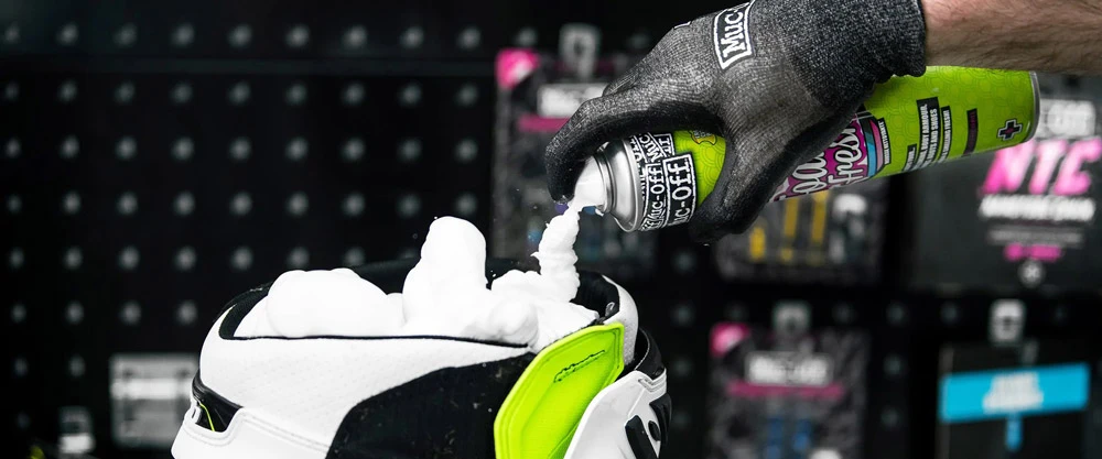 Muc-Off Foam Fresh est un nettoyant moussant très efficace et facile à utiliser – idéal pour la doublure du casque. Pour la visière du casque et les lunettes de protection, Muc-Off recommande son produit « Helmet Visor & Goggle Cleaner ».