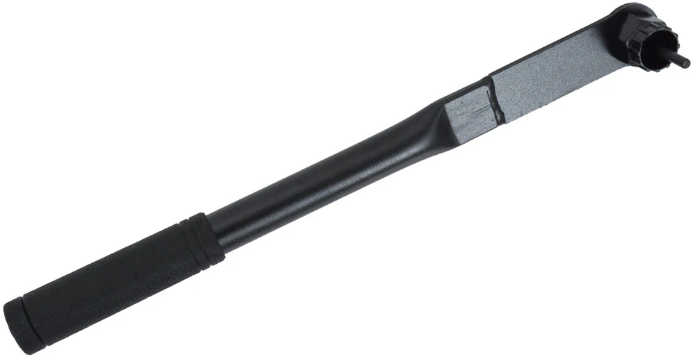 Extracteur à couronne en version extra longue pour desserrer les bagues de fermeture des cassettes compatibles Shimano et des freins à disque Center-Lock. L’extracteur à couronne permet de desserrer la bague de fermeture qui relie solidement la cassette à la roue libre. La roue libre dispose d’un filetage et sert ainsi de contrepartie à la bague de fermeture. Pour desserrer cette liaison, la roue libre est maintenue sur la cassette à l’aide d’un fouet à chaîne, puis la bague de fermeture est desserrée à l’aide de l’extracteur à couronne. La cassette peut ensuite être retirée. Le fouet à chaîne et l’extracteur de couronne sont donc toujours utilisés ensemble.