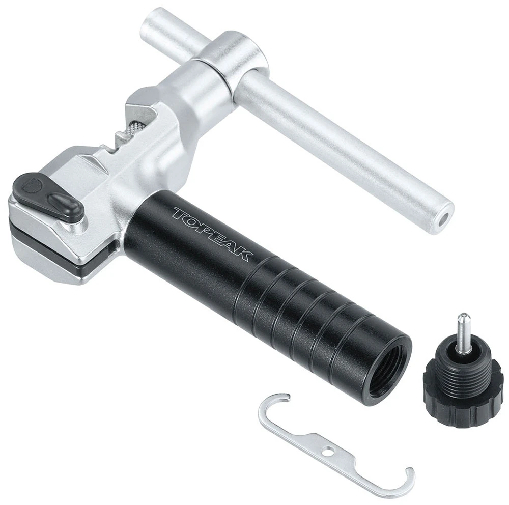 Outil à chaîne de haute qualité de Topeak avec goupille de rivet remplaçable pour les chaînes mono et multi-vitesses jusqu’à 12 vitesses ainsi que pour les chaînes Campagnolo® 11 vitesses Hollow Pin. Le crochet de fixation de la chaîne inclus permet de maintenir la chaîne en position pendant le rivetage. Le crochet de fixation de la chaîne et la goupille de rivet de rechange (inclus) sont rangés dans la poignée.